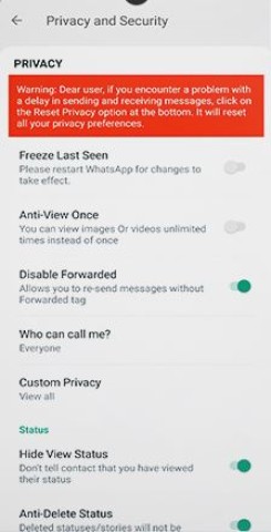 • Privacy setting: It is very beneficial for the users as they can enable several functions such as hiding online status & last seen, hiding forward message tag, seeing the erased messages & statuses, hiding blue ticks, double ticks, typing, and recording.