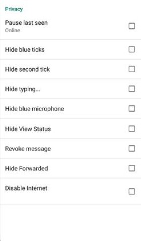 Users can enable varied options to protect their privacy such as Pause Last Seen, Hide Blue Ticks, Hide Second Ticks, Hide Typing, Hide Blue Microphone, Hide View Status, Revoke Messages, Hide Forwards, and Disable WiFi.